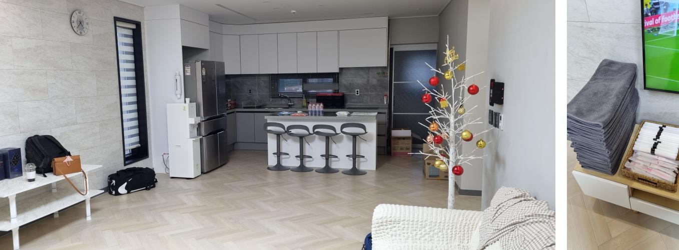 1층에는 거실, 부엌, 방 2개, 화장실 2개, 실내 테라스가 있습니다. 거실은 13명이 앉아도 충분히 앉을 정도로 넓었어요~ 부엌도 바로 옆에 있어서 음식 옮기기도 좋았고 그릇, 식기류, 냄비 등 충분히 다 갖춰져 있어서 너무 편했어요~ 그리고 정수기도 있더라고요?! 그래서 굳이 물을 사 오지 않아도 됩니다. 또 크리스마스가 다가온다고 귀여운 트리 하나 심어 놓으신 주인장님 센스!! 그리고 와~ 저는 펜션에서 일회용 칫솔치약, 샤워타월을 제공해주는 곳은 처음이었어요~ 인강 1세트씩 제공해주더라고요~