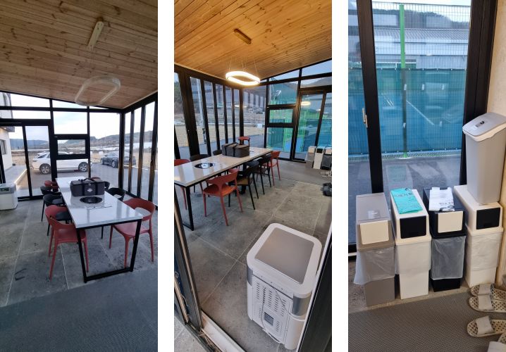 거실 옆에는 실내 테라스가 있습니다. 그곳에 가스레인지가 2개나 준비되어 있어서 고기 구워 드셔도 되고 음식을 해 드셔도 돼요. 분리수거할 수 있게 쓰레기통도 준비되어 있습니다. 단점은 환기하려고 창문을 열거나 늦은 밤이 되면 조금 춥더라고요 ㅠㅠ