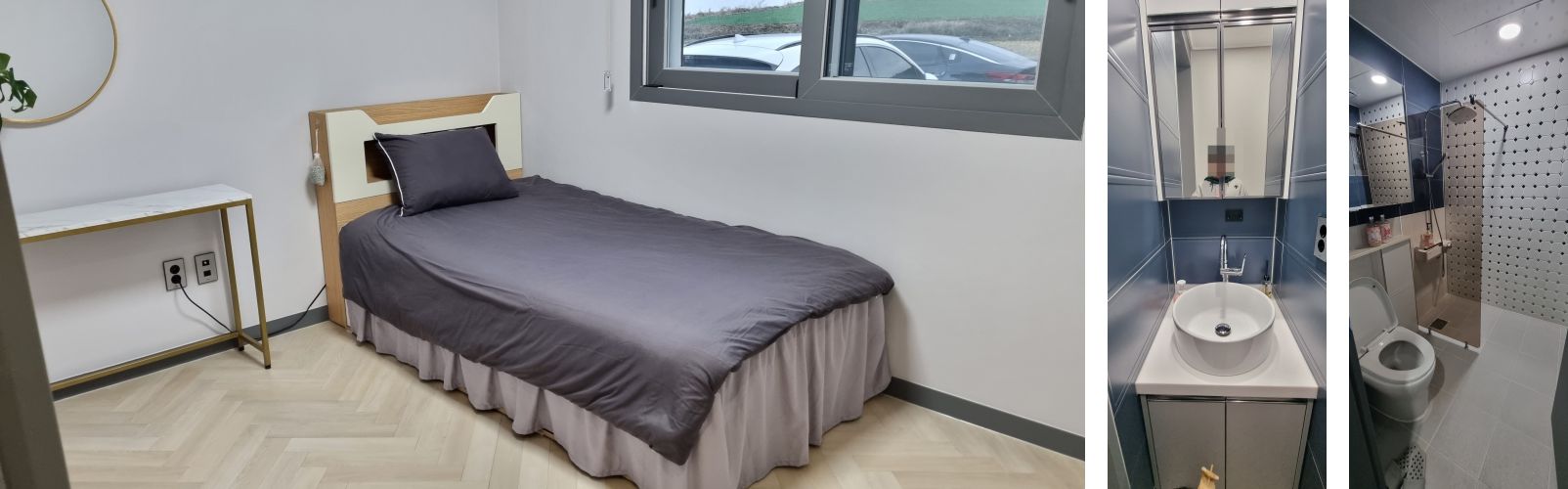 1층 작은방은 싱글 침대가 있었지만 바닥에서 한 명 더 잔다면 2명이 이용하기에도 충분히 넓었습니다. 그리고 1층 복도 중간에 화장실이 한 개 더 있었습니다. 세면대랑 화장실이 분리되어 있어서 공용으로 이용하기에 편했습니다.