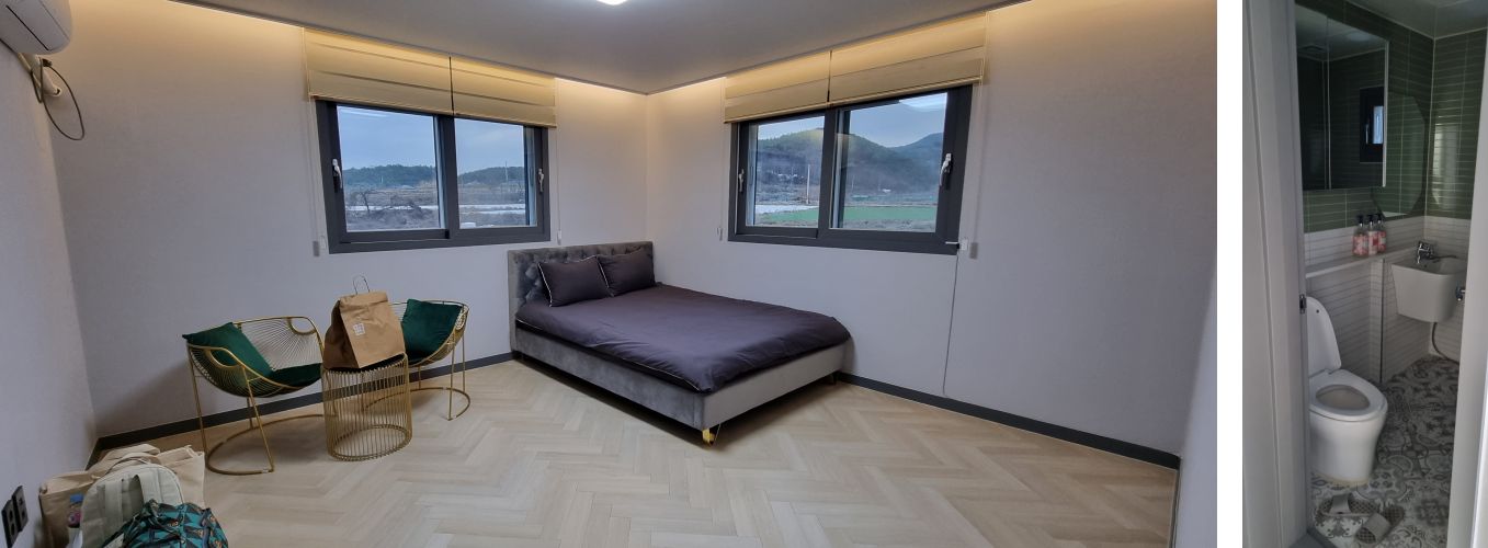 1층에는 2개의 방과 2개의 화장실이 있어요~ 큰방은 2인용 침대가 있는데도 공간이 많이 남아요. 애기 2~3명도 있는 가족이 쓰기에 충분했어요. 그리고 방안에 화장실이 하나 따로 있어서 프라이빗하게 사용할 수 있어요~