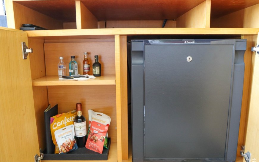 탁자 밑으로는 미니바가 있고 냉장고 안에도 여러 음료들이 있습니다. 탁자 밑 상품들은 다 요금이 발생한다는 점 주의하셔야 합니다.