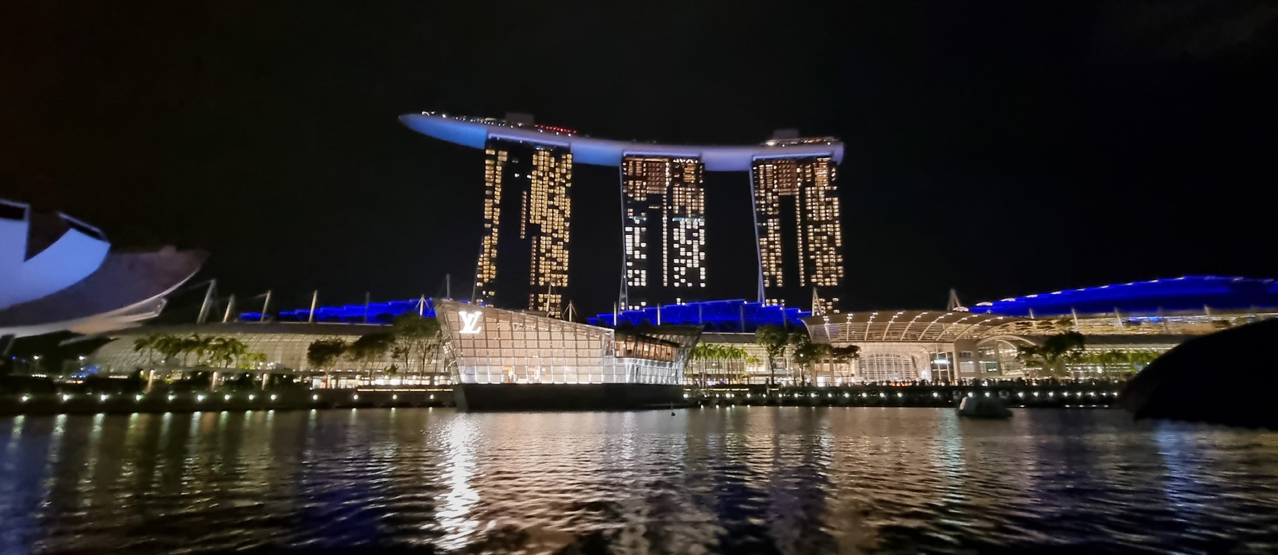 싱가포르의 랜드마크인 마리나 베이 샌즈 호텔과 루이비통 건물이 보입니다.