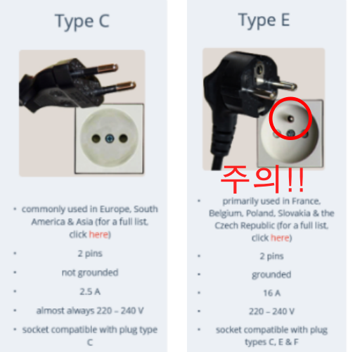 튀니지는 230V 전압을 사용합니다. 그리고 콘센트 유형은 C, E 형 2가지를 사용합니다. C형은 우리나라와 비슷해 보이지만 우리나라보다 얇은 유럽형 콘센트 유형입니다. E형은 우리나라와 같아 보이지만 중간에 튀어나온 게 있어서 다른 유형입니다. 특히나 E형은 멀티 어댑터를 사용하더라도 맞지 않는 경우가 있습니다. 그래서 E유형에 사용 가능한 멀티 어댑터로 구매하시거나 현지에서 구매하셔야 합니다.