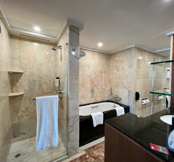 화장실은 대리석으로 되어 있어 고급스럽고 깨끗했습니다. 어메니티는 딥디크입니다. 환경보호를 위해 일회용품으로 따로 있진 않고 사워장 벽면에 다회용기로 준비되어 있습니다.